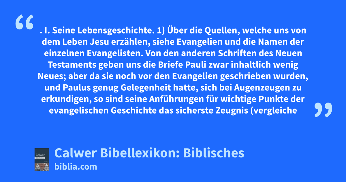 1) Über die Quellen, welche uns von dem Leben Jesu erzählen, siehe Evangelien und die Namen der einzelnen Evangelisten. Von den anderen Schriften des Neuen Testaments geben uns die Briefe Pauli zwar inhaltlich wenig Neues; aber da sie noch vor den Evangelien geschrieben wurden, und Paulus genug Gelegenheit hatte, sich bei Augenzeugen zu erkundigen, so sind seine Anführungen für wichtige Punkte der evangelischen Geschichte das sicherste Zeugnis (vergleiche namentlich 1Kor. 15, 1–8), und allen Versuchen, die Geschichtlichkeit der ganzen Person Jesu anzuzweifeln, steht Paulus als ein nicht aus dem Weg zu räumendes Hindernis entgegen. Die Apostelgeschichte bringt außer der ausführlichen Erzählung der Himmelfahrt (Apg. 1, 1–11) ein in den Evangelien nicht erzähltes Wort des Herrn (Apg. 20, 35: „Geben ist seliger, denn nehmen“). Ein paar solche Worte sind auch von den Kirchenvätern überliefert, aber ihre Echtheit ist sehr zweifelhaft (zum Beispiel: „Werdet gute Wechsler“). Sie sind gesammelt und gesichtet von A. Resch, Agrapha, 2. A., 1906. Was die apokryphen Evangelien (siehe Apokryphen) erzählen, hat keinen geschichtlichen Wert. Was der Talmud oder christenfeindliche Heiden berichten, sind Schmähungen. In des jüdischen Geschichtsschreibers Josephus Buch findet sich die Stelle: „Zu dieser Zeit lebte Jesus, ein weiser Mann, wenn anders man ihn einen Menschen nennen soll. Er war nämlich ein Täter wunderbarer Werke, ein Lehrer der Menschen, die mit Freuden die Wahrheit aufnehmen. Und viele Juden und viele Hellenen zog er zu sich heran. Er war der Messias. Und als ihn auf Anklage unserer ersten Männer Pilatus mit dem Kreuze bestraft hatte, ließen nicht ab die, welche ihn zuerst geliebt. Denn er erschien ihnen nach dreien Tagen wieder lebendig, nachdem die göttlichen Propheten dieses und tausend anderes Wunderbare über ihn gesagt hatten. Noch bis heute hat das Geschlecht derer nicht aufgehört, die von ihm Christen genannt sind.“ Aber diese Worte sind ohne Zweifel ganz oder doch zum größten Teil von einem Christen in des Josephus Werk hineingesetzt. Der römische Geschichtsschreiber Tacitus endlich weiß wenigstens von dem Tod Jesu, indem er aus Anlass der Christenverfolgung Neros schreibt: „Der Urheber dieses Namens Christus war unter der Regierung des Tiberius durch den Prokurator Pontius Pilatus hingerichtet worden.“ Somit sind wir doch ganz auf die Evangelien angewiesen, wenn wir sichere Kunde vom Leben Jesu haben wollen; und wenn sie auch auf manche Frage, die unsere Wißbegierde stellen möchte, keine Antwort geben, so reichen sie doch völlig aus, um uns in dem Glauben zu befestigen, „Jesus sei der Christ, der Sohn Gottes“ (Joh. 20, 31). —