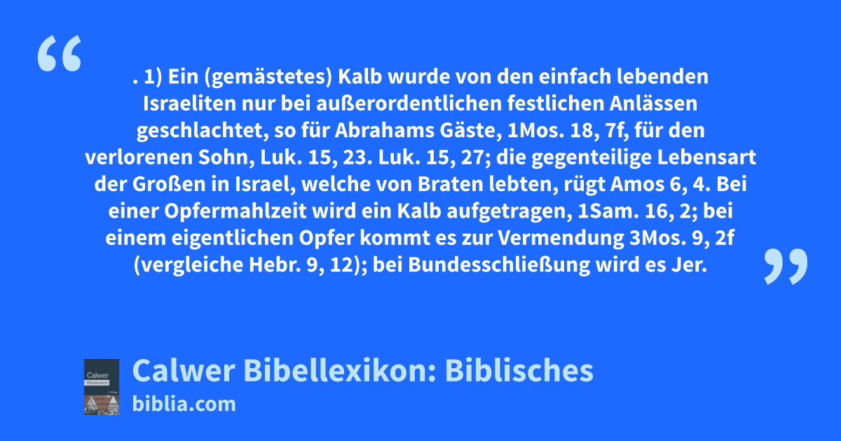 1) Ein (gemästetes) Kalb wurde von den einfach lebenden Israeliten nur bei außerordentlichen festlichen Anlässen geschlachtet, so für Abrahams Gäste, 1Mos. 18, 7f, für den verlorenen Sohn, Luk. 15, 23. Luk. 15, 27; die gegenteilige Lebensart der Großen in Israel, welche von Braten lebten, rügt Amos 6, 4. Bei einer Opfermahlzeit wird ein Kalb aufgetragen, 1Sam. 16, 2; bei einem eigentlichen Opfer kommt es zur Vermendung 3Mos. 9, 2f (vergleiche Hebr. 9, 12); bei Bundesschließung wird es Jer. 34, 18f zerteilt nach Art von 1Mos. 15, 17.
