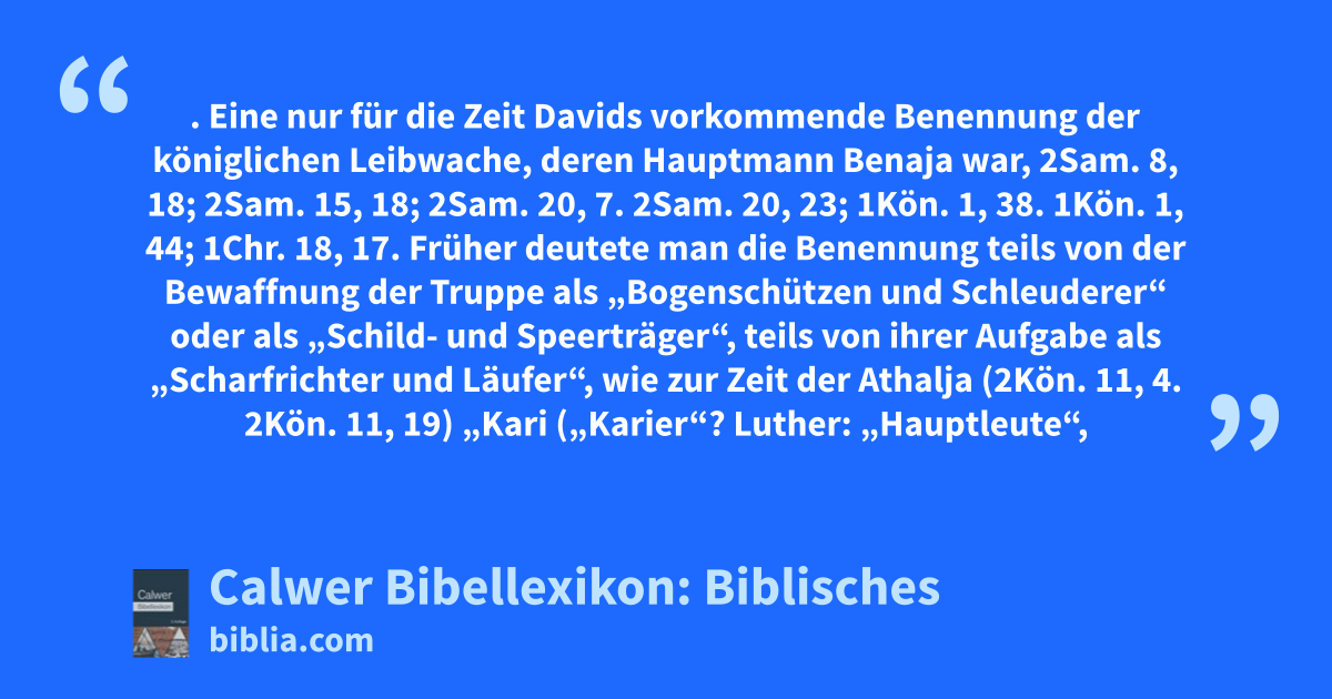 Früher deutete man die Benennung teils von der Bewaffnung der Truppe als „Bogenschützen und Schleuderer“ oder als „Schild- und Speerträger“, teils von ihrer Aufgabe als „Scharfrichter und Läufer“, wie zur Zeit der Athalja (2Kön. 11, 4. 2Kön. 11, 19) „Kari („Karier“? Luther: „Hauptleute“, jetzt: „Leibwächter“) und Läufer vorkommen. Nach der auch von Luther befolgten Auffassung sind die Ausdrücke Stammesnamen, welche diese Söldner nach ihrer Herkunft als Kreter (siehe Kaphthor) und Philister bezeichnen, wobei die gewöhnliche Benennung „Pelischti“ des Gleichklangs wegen in „Plethi“ abgeändert wurde. Ein Itthai aus Gath stand 2Sam. 15, 18 mit 600 Mann in Davids Dienst.