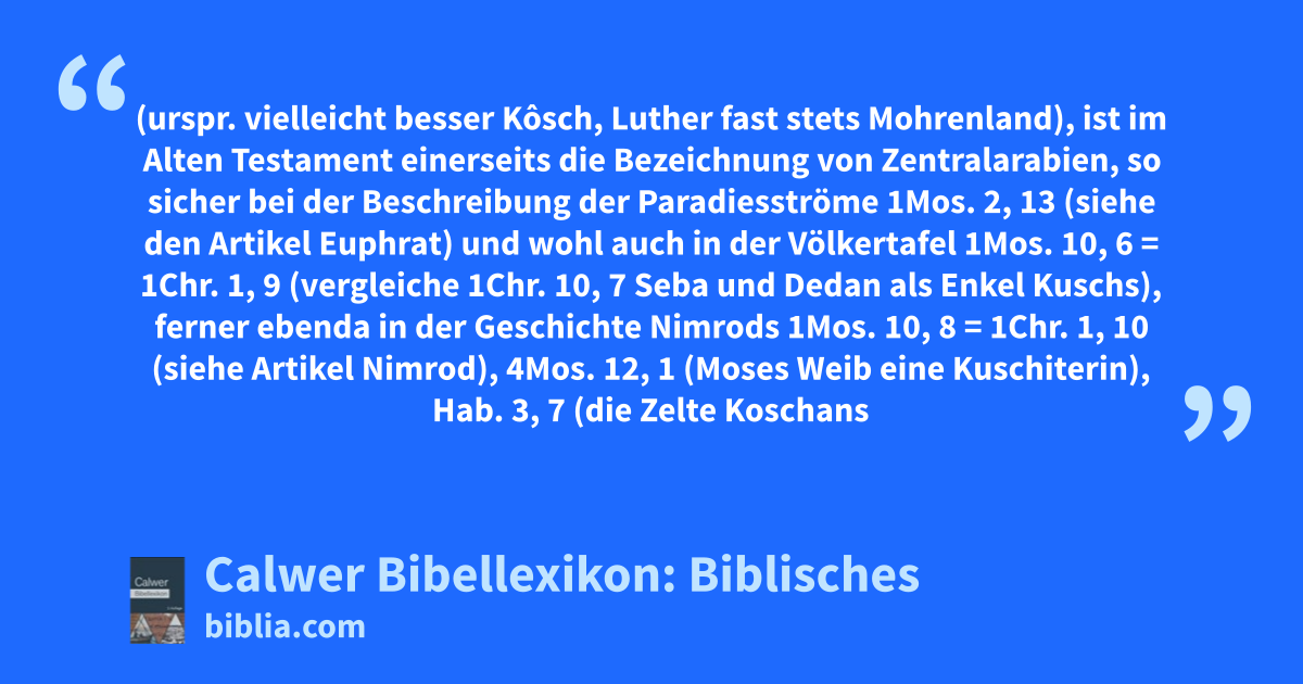 Kusch (urspr. vielleicht besser Kôsch, Luther fast stets Mohrenland), ist im Alten Testament einerseits die Bezeichnung von Zentralarabien, so sicher bei der Beschreibung der Paradiesströme 1Mos. 2, 13 (siehe den Artikel Euphrat) und wohl auch in der Völkertafel 1Mos. 10, 6 = 1Chr. 1, 9 (vergleiche 1Chr. 10, 7 Seba und Dedan als Enkel Kuschs), ferner ebenda in der Geschichte Nimrods 1Mos. 10, 8 = 1Chr. 1, 10 (siehe Artikel Nimrod), 4Mos. 12, 1 (Moses Weib eine Kuschiterin), Hab. 3, 7 (die Zelte Koschans neben Midian), und 2Chr. 14, 11ff der Kuschite Zerach (siehe dort und vergleiche die 2Chr. 14, 14 erwähnten Kamele), andererseits aber, so sicher von 2Kön. 19, 9 (= Jes. 37, 9) an (siehe den Artikel Thirhaka), Oberägypten-Nubien, wo um jene Zeit ein mit Ägypten rivalisierendes Reich entstanden war.