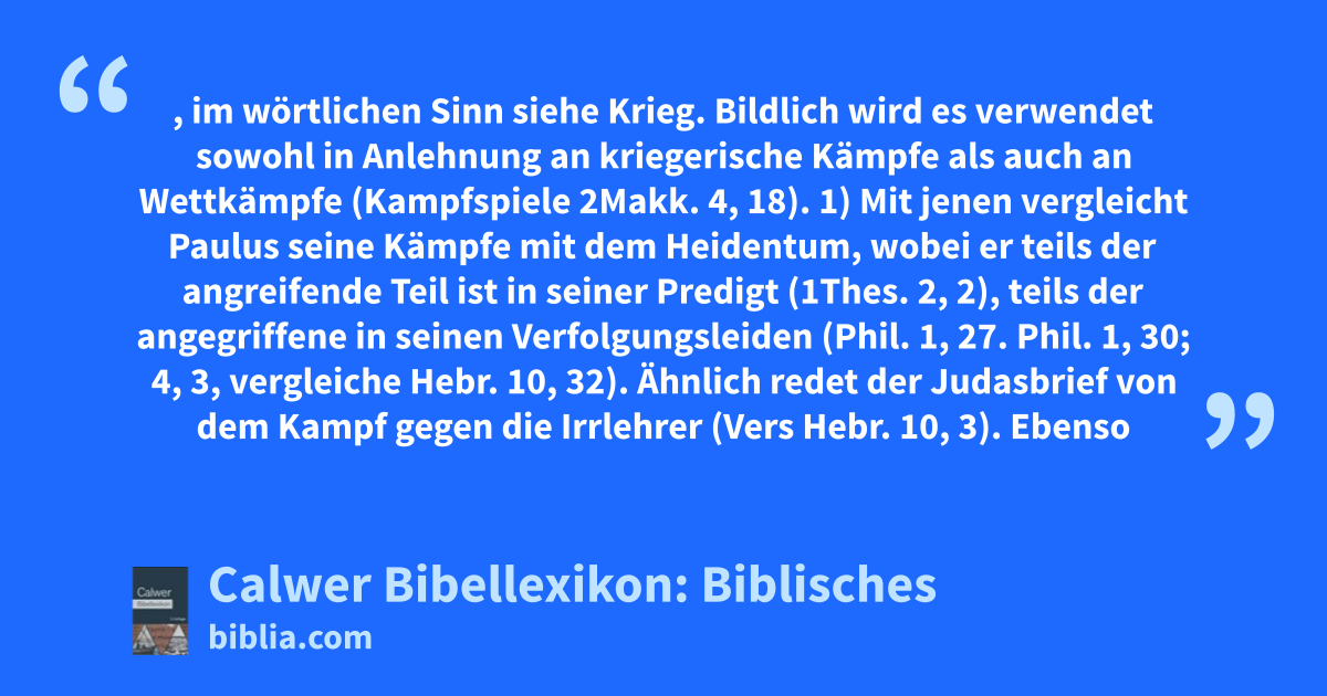 1) Mit jenen vergleicht Paulus seine Kämpfe mit dem Heidentum, wobei er teils der angreifende Teil ist in seiner Predigt (1Thes. 2, 2), teils der angegriffene in seinen Verfolgungsleiden (Phil. 1, 27. Phil. 1, 30; 4, 3, vergleiche Hebr. 10, 32). Ähnlich redet der Judasbrief von dem Kampf gegen die Irrlehrer (Vers Hebr. 10, 3). Ebenso beschreibt Paulus sein Sorgen und Beten für seine Gemeinden als ein Ringen (Röm. 15, 30; Kol. 2, 1 vergleiche Jakobs Kampf mit Gott, 1Mos. 32, 29; Hos. 12, 4. Hos. 12, 5; Weish. 10, 12, siehe Jakob). Im eigenen Christenstand hat der Christ zu kämpfen mit den Mächten der Finsternis, die teils verführend, teils in Anfechtung versenkend ihn bedrohen (Eph. 6, 12). Ein Kampf gegen die zum Abfall hinneigende Schwachheit des eigenen Herzens ist Hebr. 12, 4 gemeint.
