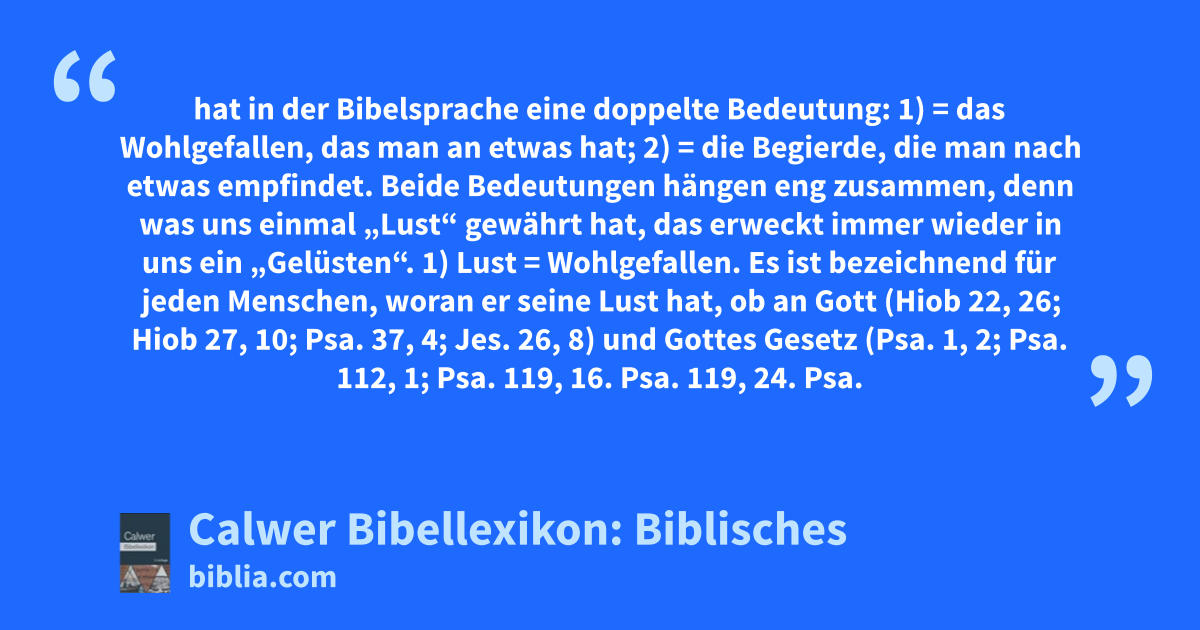 1) Lust = Wohlgefallen. Es ist bezeichnend für jeden Menschen, woran er seine Lust hat, ob an Gott (Hiob 22, 26; Hiob 27, 10; Psa. 37, 4; Jes. 26, 8) und Gottes Gesetz (Psa. 1, 2; Psa. 112, 1; Psa. 119, 16. Psa. 119, 24. Psa. 119, 35. Psa. 119, 47. Psa. 119, 70. Psa. 119, 117) und Gottes Werken (Psa. 111, 2), oder an den vergänglichen Gütern der Welt (Spr. 12, 5; Offb. 18, 12–14) und an der Ungerechtigkeit (2Thes. 2, 12, vergleiche Micha 4, 11; Psa. 22, 18). — Die Bibel betont ferner, dass man das Gute mit Lust, nicht mit innerem Widerwillen, nicht gezwungen tue (Röm. 12, 8; Sir. 35, 20). Auch für die Erkenntnis des Wesens und Willens Gottes ist es sehr wichtig, zu wissen, woran er seine Lust hat. Von Anfang ist seine Lust an den Menschenkindern (Spr. 8, 31), d. h. sie sind der Gegenstand seines Wohlgefallens und sollen es immer mehr werden. Es ist ihm eine Lust, wenn er ihnen Gutes tun kann (Jer. 32, 41); und des Frommen höchster Trost ist es, zu wissen, dass Gott „Lust“ zu ihm hat (Psa. 18, 20; 2Sam. 15, 26; Jes. 62, 4 — vergleiche den unbewusst die Wahrheit redenden Spott der Gottlosen: Psa. 22, 9; Matth. 27, 43). Und er schenkt es dann den Seinen, dass sie ihre Lust an ihm (siehe oben), an seiner Gnade (Micha 7, 9; Psa. 37, 11, vergleiche Jes. 53, 11) haben dürfen. Aber was sein Wohlgefallen erwirbt, das sind nicht solche Vorzüge, die der Menschen Blicke auf sich ziehen (Psa. 147, 10), auch nicht solche Werke, mit denen man sein Wohlgefallen erkaufen möchte, wie Opfer, sondern demütige Gottesfurcht, selbstverleugnender Gehorsam, aufrichtige Nächstenliebe (1Sam. 15, 22; Psa. 51, 18; Jes. 1, 11; Hos. 6, 6).