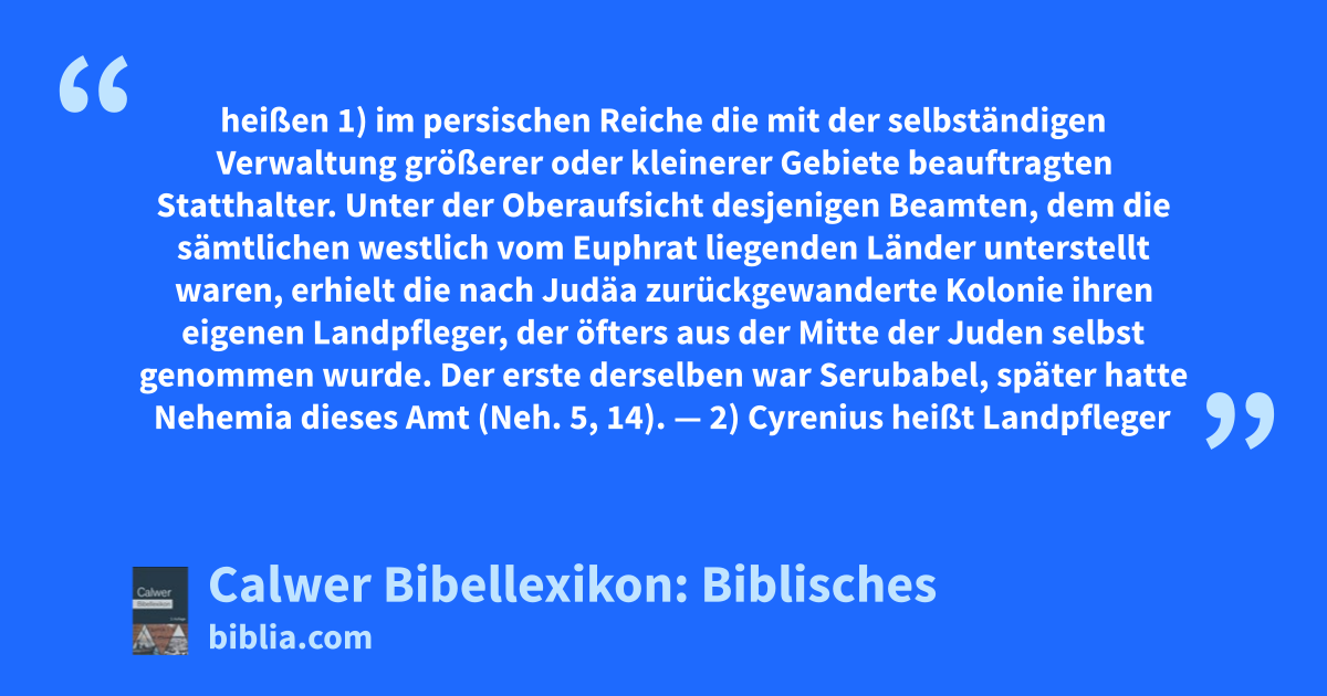 1) im persischen Reiche die mit der selbständigen Verwaltung größerer oder kleinerer Gebiete beauftragten Statthalter. Unter der Oberaufsicht desjenigen Beamten, dem die sämtlichen westlich vom Euphrat liegenden Länder unterstellt waren, erhielt die nach Judäa zurückgewanderte Kolonie ihren eigenen Landpfleger, der öfters aus der Mitte der Juden selbst genommen wurde. Der erste derselben war Serubabel, später hatte Nehemia dieses Amt (Neh. 5, 14).