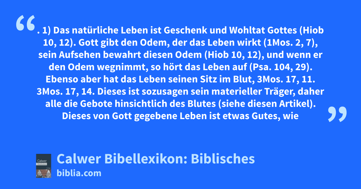 1) Das natürliche Leben ist Geschenk und Wohltat Gottes (Hiob 10, 12). Gott gibt den Odem, der das Leben wirkt (1Mos. 2, 7), sein Aufsehen bewahrt diesen Odem (Hiob 10, 12), und wenn er den Odem wegnimmt, so hört das Leben auf (Psa. 104, 29). Ebenso aber hat das Leben seinen Sitz im Blut, 3Mos. 17, 11. 3Mos. 17, 14.