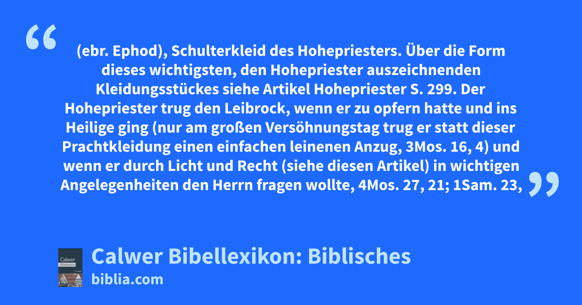 — Außer dem Leibrock des Hohepriesters werden aber auch noch „leinene Leibröcke“ der Priester genannt, 1Sam. 22, 18. Der Knabe Samuel trägt einen solchen leinenen Leibrock, 1Sam. 2, 18, ja auch der König David war, als er die Bundeslade abholte, begürtet mit einem leinenen „Leibrock“, 2Sam. 6, 14; 1Chr. 15, 27, hierbei fehlte aber natürlich gerade das Wesentliche und Wichtigste beim Leibrock, nämlich das Brustschildlein mit Urim und Tummim, und es ist dieser leinene Leibrock als Priesterschmuck anzusehen. Anders dagegen der Leibrock, den Gideon machte, Richt. 8, 27, und der des Micha, Richt. 17, 5. Manche glauben, weil in Richt. 8, 24ff von einer — vielleicht übertrieben — großen Menge von Gold und Kostbarkeiten, aus denen der Leibrock gemacht wurde, die Rede ist und weil es V. Richt. 8, 27 heißt: er setzte es (eigentlich: stellte es auf) zu Ophra, es sei darunter wohl ein Bild Gottes zu verstehen. Es ist aber doch nicht wahrscheinlich, dass das Wort, das so oft den Leibrock bezeichnet, hier eine ganz andere Bedeutung haben sollte. Wohl aber ist anzunehmen, dass hier mit dem Leibrock das Urim und Tummim als Orakel abergläubisch gebraucht wurde, wie ja Hos. 3, 4 neben dem Leibrock die Teraphim (siehe Abgötterei) erwähnt sind, vergleiche Richt. 8, 27: Israel verhurete sich daran.