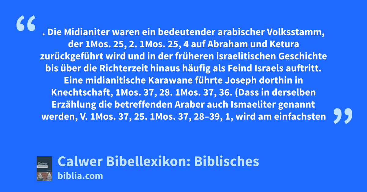 Midian, Midianiter. Die Midianiter waren ein bedeutender arabischer Volksstamm, der 1Mos. 25, 2. 1Mos. 25, 4 auf Abraham und Ketura zurückgeführt wird und in der früheren israelitischen Geschichte bis über die Richterzeit hinaus häufig als Feind Israels auftritt.