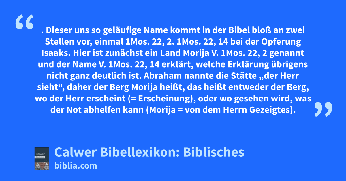 Morija. Dieser uns so geläufige Name kommt in der Bibel bloß an zwei Stellen vor, einmal 1Mos. 22, 2. 1Mos. 22, 14 bei der Opferung Isaaks.