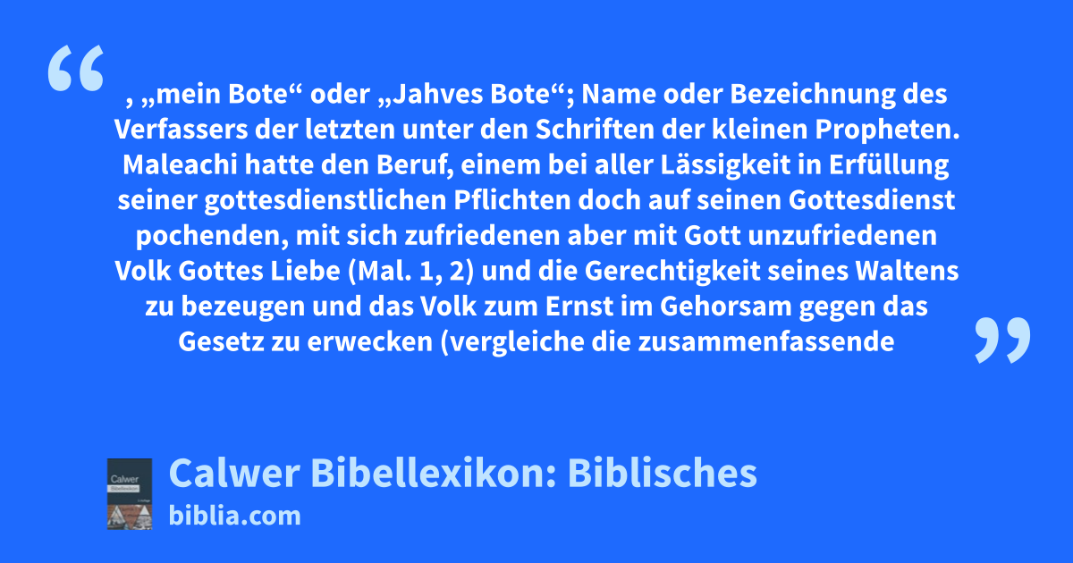 Maleachi, „mein Bote“ oder „Jahves Bote“; Name oder Bezeichnung des Verfassers der letzten unter den Schriften der kleinen Propheten. Maleachi hatte den Beruf, einem bei aller Lässigkeit in Erfüllung seiner gottesdienstlichen Pflichten doch auf seinen Gottesdienst pochenden, mit sich zufriedenen aber mit Gott unzufriedenen Volk Gottes Liebe (Mal. 1, 2) und die Gerechtigkeit seines Waltens zu bezeugen und das Volk zum Ernst im Gehorsam gegen das Gesetz zu erwecken (vergleiche die zusammenfassende Schlußermahnung 3, 22).