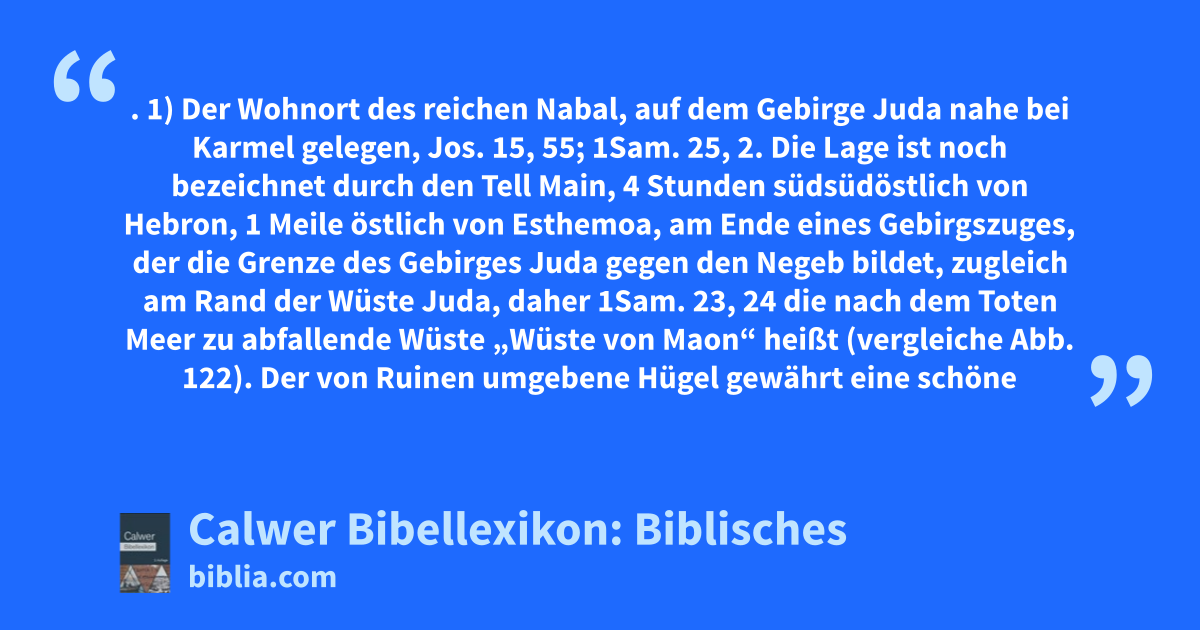 1) Der Wohnort des reichen Nabal, auf dem Gebirge Juda nahe bei Karmel gelegen, Jos. 15, 55; 1Sam. 25, 2. Die Lage ist noch bezeichnet durch den Tell Main, 4 Stunden südsüdöstlich von Hebron, 1 Meile östlich von Esthemoa, am Ende eines Gebirgszuges, der die Grenze des Gebirges Juda gegen den Negeb bildet, zugleich am Rand der Wüste Juda, daher 1Sam. 23, 24 die nach dem Toten Meer zu abfallende Wüste „Wüste von Maon“ heißt (vergleiche Abb. 122).