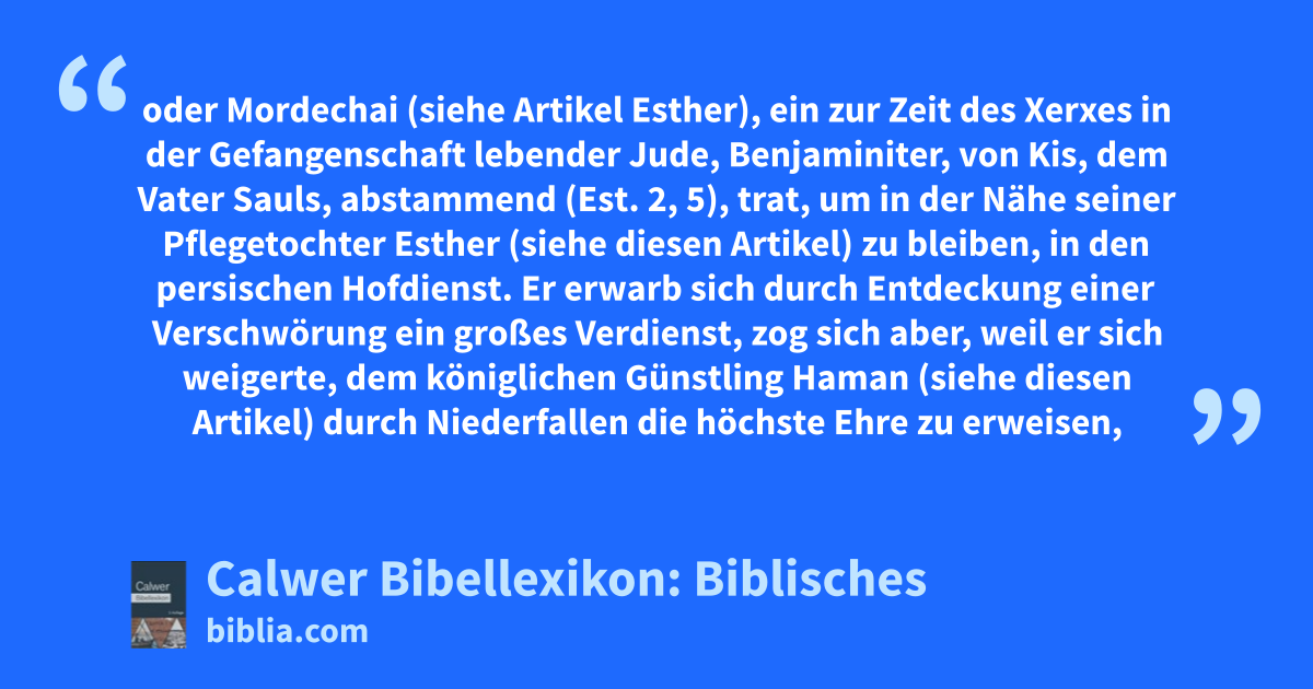 Mardochai oder Mordechai (siehe Artikel Esther), ein zur Zeit des Xerxes in der Gefangenschaft lebender Jude, Benjaminiter, von Kis, dem Vater Sauls, abstammend (Est. 2, 5), trat, um in der Nähe seiner Pflegetochter Esther (siehe diesen Artikel) zu bleiben, in den persischen Hofdienst.