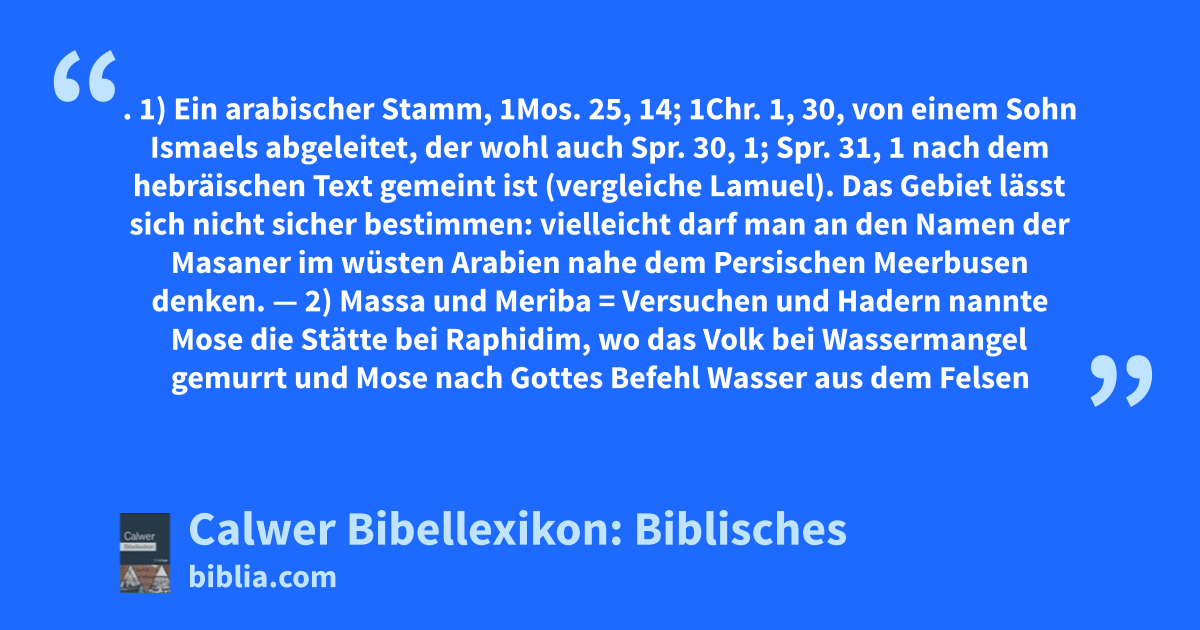 1) Ein arabischer Stamm, 1Mos. 25, 14; 1Chr. 1, 30, von einem Sohn Ismaels abgeleitet, der wohl auch Spr. 30, 1; Spr. 31, 1 nach dem hebräischen Text gemeint ist (vergleiche Lamuel). Das Gebiet lässt sich nicht sicher bestimmen: vielleicht darf man an den Namen der Masaner im wüsten Arabien nahe dem Persischen Meerbusen denken.
