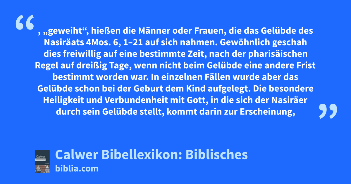 Nasiräer, „geweiht“, hießen die Männer oder Frauen, die das Gelübde des Nasiräats 4Mos. 6, 1–21 auf sich nahmen. Gewöhnlich geschah dies freiwillig auf eine bestimmte Zeit, nach der pharisäischen Regel auf dreißig Tage, wenn nicht beim Gelübde eine andere Frist bestimmt worden war. In einzelnen Fällen wurde aber das Gelübde schon bei der Geburt dem Kind aufgelegt.