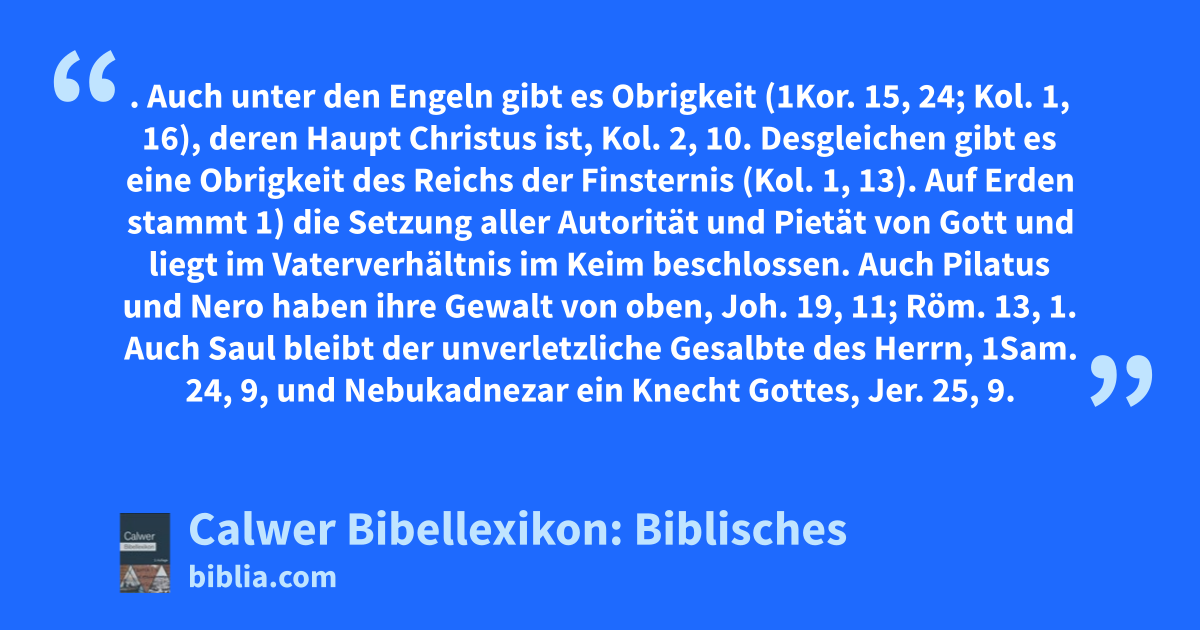 Obrigkeit. Auch unter den Engeln gibt es Obrigkeit (1Kor. 15, 24; Kol. 1, 16), deren Haupt Christus ist, Kol. 2, 10. Desgleichen gibt es eine Obrigkeit des Reichs der Finsternis (Kol. 1, 13). Auf Erden stammt