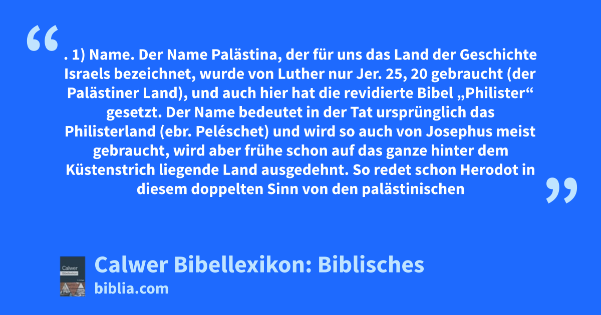 1) Name. Der Name Palästina, der für uns das Land der Geschichte Israels bezeichnet, wurde von Luther nur Jer. 25, 20 gebraucht (der Palästiner Land), und auch hier hat die revidierte Bibel „Philister“ gesetzt. Der Name bedeutet in der Tat ursprünglich das Philisterland (ebr. Peléschet) und wird so auch von Josephus meist gebraucht, wird aber frühe schon auf das ganze hinter dem Küstenstrich liegende Land ausgedehnt. So redet schon Herodot in diesem doppelten Sinn von den palästinischen Syrern und dem palästinischen Syrien. Schließlich ist die weitere Bedeutung herrschend geworden. So brauchten den Namen griechische und römische Schriftsteller, und so ist er, namentlich durch Hieronymus, auch unter den Christen für das Land des Volkes Israel üblich geworden, ohne dass man dem so benannten Land bestimmte Grenzen gegeben hätte. Man dachte vor allem an das Westjordanland. — Im Alten Testament ist die gewöhnliche Bezeichnung des Landes Kanaan (siehe diesen Artikel), eine Bezeichnung, deren ursprünglicher Sinn unsicher ist und die noch mehr als der Name Palästina ein verschieden begrenztes Gebiet umfasst (siehe unten). — Im Lauf der Geschichte sind manche andere Bezeichnungen gebraucht worden, nicht alle eigentliche Eigennamen, so „Land Israel“ (1Sam. 13, 19), „Land der Hebräer“ (1Mos. 40, 15) und andere. Nach der Makkabäerzeit wurden die Namen „Judäa“, auch „Idumäa“ für das ganze Land gebraucht. Bei den Christen hat sich der Name „das heilige Land“ (Sach. 2, 16) und „das gelobte (= verheißene) Land“ (vergleiche Hebr. 11, 9) eingebürgert. Assyrer und Babylonier brauchten für Palästina und die nördlichen angrenzenden Gebiete verschiedene Namen: Amurru, Kanaan, Land Hatti (der Hethiter), Ebir nari (= das Land im Westen des Euphrat). Spätere griechische Geographen wie Strabo nennen auch das ganze Land vom Orontes bis Ägypten und bis Arabien „Cölesyrien“ und gliedern dies wieder in Cölesyrien im engeren Sinn, Phönizien und Judäa.