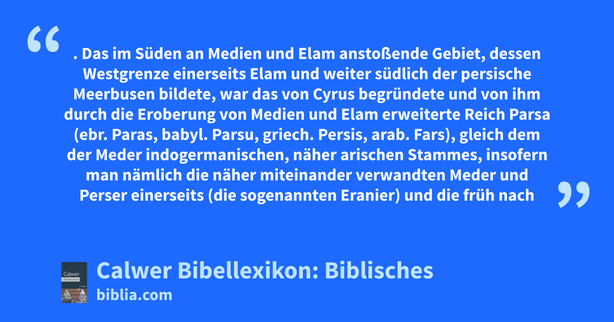 Perser, Persien. Das im Süden an Medien und Elam anstoßende Gebiet, dessen Westgrenze einerseits Elam und weiter südlich der persische Meerbusen bildete, war das von Cyrus begründete und von ihm durch die Eroberung von Medien und Elam erweiterte Reich Parsa (ebr. Paras, babyl. Parsu, griech. Persis, arab. Fars), gleich dem der Meder indogermanischen, näher arischen Stammes, insofern man nämlich die näher miteinander verwandten Meder und Perser einerseits (die sogenannten Eranier) und die früh nach Osten gewanderten Inder andererseits speziell unter den Namen Arier zusammenfasst. Alles weist darauf hin, dass die Perser ursprünglich nur ein medischer Stamm waren, sich also erst (etwa ein Jahrhundert vor Cyrus) von den Medern abzweigten.