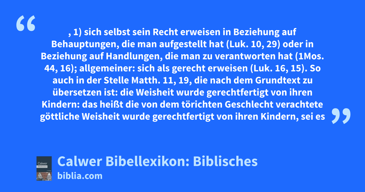 — 2) Rechtfertigen als Akt des Richters = einen Angeklagten für unschuldig erklären, namentlich von Gott, wenn er über einen Menschen ein Urteil spricht (2Chr. 6, 23; Matth. 12, 37; 1Kor. 4, 4). Röm. 5, 18: die Rechtfertigung des Lebens ist das freisprechende Urteil Gottes, dass wir nicht sterben müssen, sondern leben dürfen. Über die Frage der Rechtfertigung aus den Werken oder aus dem Glauben siehe Artikel Gerechtigkeit S. 223, sowie Kirchenlexikon II, 516 ff. — Röm. 6, 7: „Wer gestorben ist, der ist gerechtfertigt von der Sünde“ ist nach dem Zusammenhang so zu erklären: wer, wie die vorangehenden Verse sagen, mit Christus gestorben ist, an den hat die Sünde kein Recht mehr, ihn in ihre Knechtschaft zu zwingen (vergleiche Röm. 8, 12: So sind wir nun Schuldner nicht dem Fleisch, dass wir nach dem Fleisch leben).