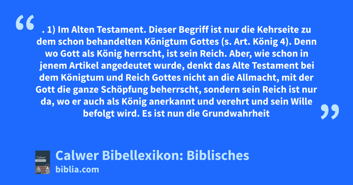 1) Im Alten Testament. Dieser Begriff ist nur die Kehrseite zu dem schon behandelten Königtum Gottes (s. Art. König 4). Denn wo Gott als König herrscht, ist sein Reich. Aber, wie schon in jenem Artikel angedeutet wurde, denkt das Alte Testament bei dem Königtum und Reich Gottes nicht an die Allmacht, mit der Gott die ganze Schöpfung beherrscht, sondern sein Reich ist nur da, wo er auch als König anerkannt und verehrt und sein Wille befolgt wird. Es ist nun die Grundwahrheit des ganzen Alten Testaments, dass er sich Israel erwählt hat zu seinem Reich (2Mos. 19, 6), oder, wie es gewöhnlich heißt, zu seinem „Volk“ (s. Volk). Und das Reich Gottes fällt daher zusammen mit dem Reich seines Gesalbten, des israelitischen Königs. Nur weissagend wird von einer Ausdehnung des Reichs Gottes über die ganze Erde geredet (vergleiche König 4).