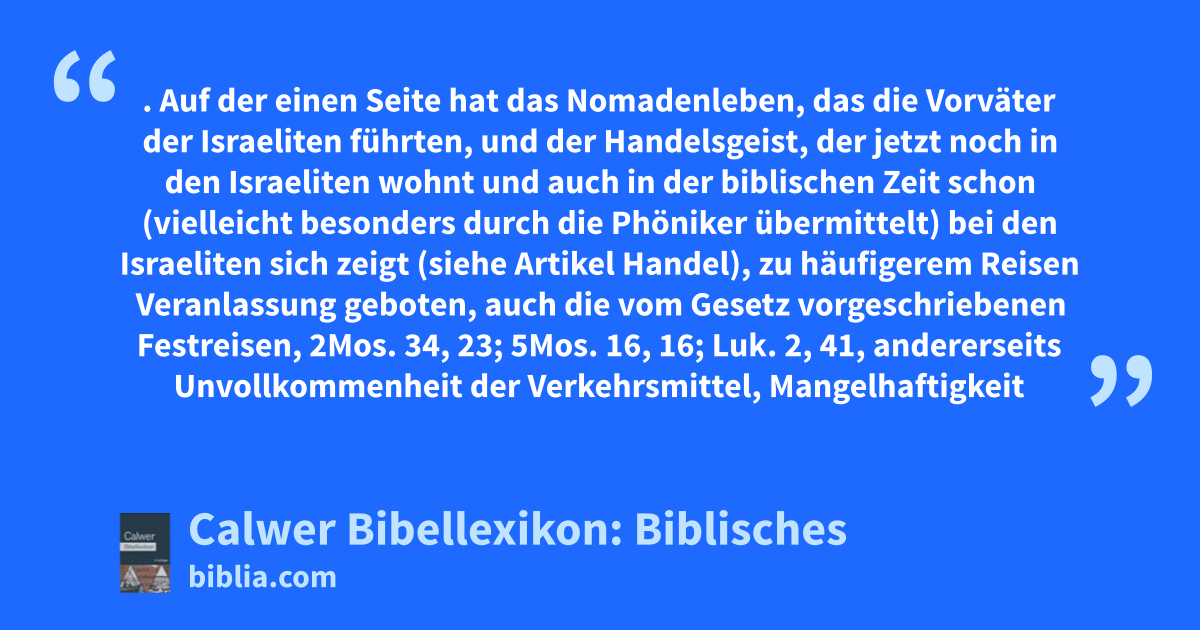 Reise, Reisen. Auf der einen Seite hat das Nomadenleben, das die Vorväter der Israeliten führten, und der Handelsgeist, der jetzt noch in den Israeliten wohnt und auch in der biblischen Zeit schon (vielleicht besonders durch die Phöniker übermittelt) bei den Israeliten sich zeigt (siehe Artikel Handel), zu häufigerem Reisen Veranlassung geboten, auch die vom Gesetz vorgeschriebenen Festreisen, 2Mos. 34, 23; 5Mos. 16, 16; Luk. 2, 41, andererseits Unvollkommenheit der Verkehrsmittel, Mangelhaftigkeit der Straßen (siehe diesen Artikel), der Herbergen (siehe diesen Artikel), auch Unsicherheit der Wege hemmend eingewirkt, sodass weite Reisen, wie zum Beispiel die des Paulus, etwas weit Ungewöhnlicheres und Schwierigeres waren als heutzutage.