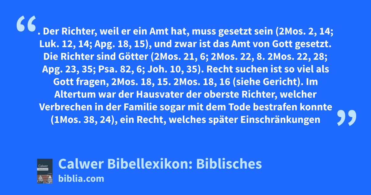 Richter. Der Richter, weil er ein Amt hat, muss gesetzt sein (2Mos. 2, 14; Luk. 12, 14; Apg. 18, 15), und zwar ist das Amt von Gott gesetzt. Die Richter sind Götter (2Mos. 21, 6; 2Mos. 22, 8. 2Mos. 22, 28; Apg. 23, 35; Psa. 82, 6; Joh. 10, 35). Recht suchen ist so viel als Gott fragen, 2Mos. 18, 15. 2Mos. 18, 16 (siehe Gericht).