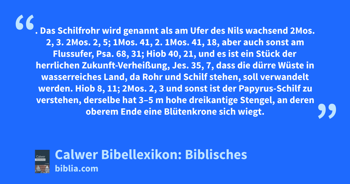 Schilf, Rohr. Das Schilfrohr wird genannt als am Ufer des Nils wachsend 2Mos. 2, 3. 2Mos. 2, 5; 1Mos. 41, 2. 1Mos. 41, 18, aber auch sonst am Flussufer, Psa. 68, 31; Hiob 40, 21, und es ist ein Stück der herrlichen Zukunft-Verheißung, Jes. 35, 7, dass die dürre Wüste in wasserreiches Land, da Rohr und Schilf stehen, soll verwandelt werden.