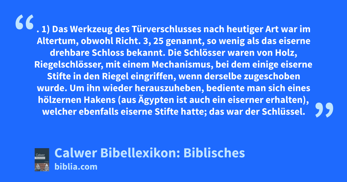 1) Das Werkzeug des Türverschlusses nach heutiger Art war im Altertum, obwohl Richt. 3, 25 genannt, so wenig als das eiserne drehbare Schloss bekannt. Die Schlösser waren von Holz, Riegelschlösser, mit einem Mechanismus, bei dem einige eiserne Stifte in den Riegel eingriffen, wenn derselbe zugeschoben wurde. Um ihn wieder herauszuheben, bediente man sich eines hölzernen Hakens (aus Ägypten ist auch ein eiserner erhalten), welcher ebenfalls eiserne Stifte hatte; das war der Schlüssel. Diese Schlösser konnten leicht geöffnet werden, daher waren Türhüter und Türhüterinnen sehr nötig.