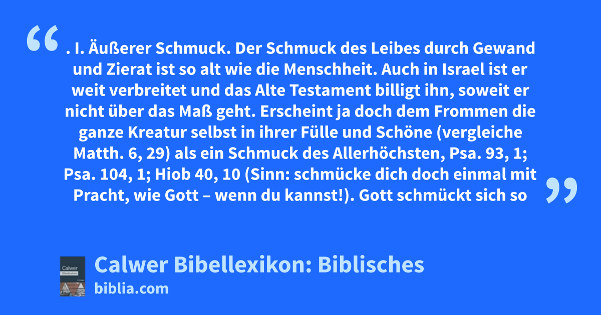 Der Schmuck des Leibes durch Gewand und Zierat ist so alt wie die Menschheit. Auch in Israel ist er weit verbreitet und das Alte Testament billigt ihn, soweit er nicht über das Maß geht. Erscheint ja doch dem Frommen die ganze Kreatur selbst in ihrer Fülle und Schöne (vergleiche Matth. 6, 29) als ein Schmuck des Allerhöchsten, Psa. 93, 1; Psa. 104, 1; Hiob 40, 10 (Sinn: schmücke dich doch einmal mit Pracht, wie Gott – wenn du kannst!). Gott schmückt sich so selbst; er kann von Menschen nicht geschmückt werden, wie es die Heiden mit ihren Götzen tun (Jer. 10, 4); aber der Ort, wo er wohnt, das Heiligtum, soll und darf schön geschmückt, herrlich, lieblich sein (Psa. 118, 27; Jes. 52, 1; Jes. 60, 13), und ebenso sollen es die Diener des Heiligtums sein (2Chr. 20, 21), und das ganze Volk, wenn es die Ehre und die Feste des Herrn gilt, Psa. 29, 2; Psa. 96, 9; Psa. 110, 3; 1Chr. 16, 29, aber auch im Privatleben. (S. Geschmeide.) Übertreibung und Üppigkeit im Schmuck straft Jes. 3, 16ff, während als Bild der Treue gegen den Herrn angeführt wird, dass eine Jungfrau ihres Schmuckes nicht vergesse, Jer. 2, 23; vergleiche Jes. 61, 10; 2Sam. 1, 24. In Zeiten der Trauer legte man ihn ab, 2Mos. 33, 4ff, auch vor dem Herrn, Jer. 41, 5.
