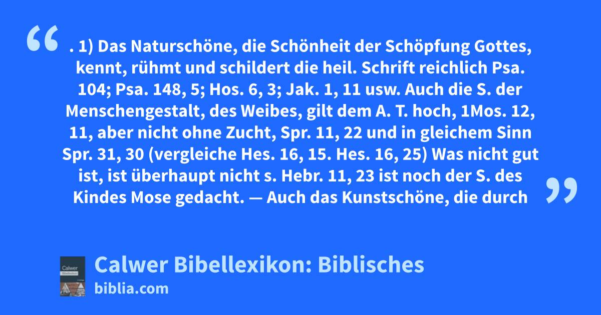 1) Das Naturschöne, die Schönheit der Schöpfung Gottes, kennt, rühmt und schildert die heil. Schrift reichlich Psa. 104; Psa. 148, 5; Hos. 6, 3; Jak. 1, 11 usw. Auch die S. der Menschengestalt, des Weibes, gilt dem A. T. hoch, 1Mos. 12, 11, aber nicht ohne Zucht, Spr. 11, 22 und in gleichem Sinn Spr. 31, 30 (vergleiche Hes. 16, 15. Hes. 16, 25) Was nicht gut ist, ist überhaupt nicht s. Hebr. 11, 23 ist noch der S. des Kindes Mose gedacht. — Auch das Kunstschöne, die durch (menschliche) Kunst hervorgebrachte S. und s. Gestalt in den „schönen Gottesdiensten“ (Psa. 27, 4 „das Liebliche des Herrn“, d. h. seine Wohnung, Psa. 84, 2), im „heiligen Schmuck“ des Heiligtums und des Volkes ist ihr nicht fremd, s. d. Artt. Kunst und Schmuck.
