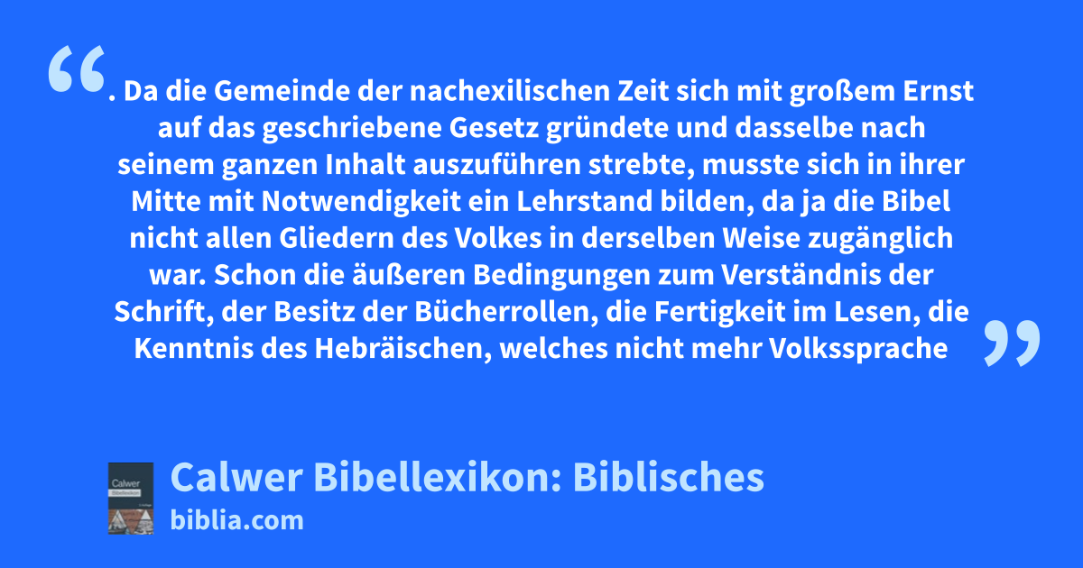 Schriftgelehrte. Da die Gemeinde der nachexilischen Zeit sich mit großem Ernst auf das geschriebene Gesetz gründete und dasselbe nach seinem ganzen Inhalt auszuführen strebte, musste sich in ihrer Mitte mit Notwendigkeit ein Lehrstand bilden, da ja die Bibel nicht allen Gliedern des Volkes in derselben Weise zugänglich war. Schon die äußeren Bedingungen zum Verständnis der Schrift, der Besitz der Bücherrollen, die Fertigkeit im Lesen, die Kenntnis des Hebräischen, welches nicht mehr Volkssprache war, waren nicht allen gegeben; dazu kommen die inneren Schwierigkeiten, welche dem Verständnis der Schrift entgegenstehen und die sich nur durch anhaltende, hingebende Beschäftigung mit ihr überwinden lassen. Die nachexilische Gemeinde war von der Überzeugung durchdrungen, es gelte die Schrift zu studieren, um eine sichere und eindringende Kenntnis derselben zu erlangen. So entstand ein Kreis von Männern, welche das Studium der Schrift als ihre Lebensaufgabe betrieben und darum auch als die berufenen Ausleger derselben galten, die Schriftgelehrten, Rabbinen.