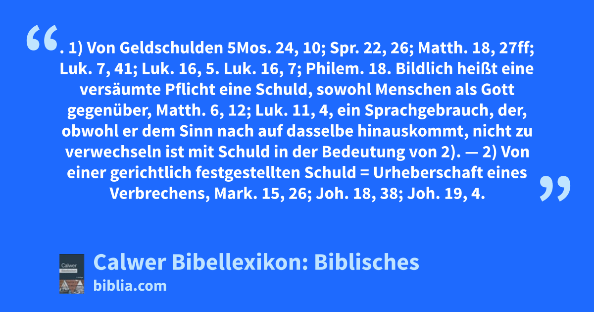 1) Von Geldschulden 5Mos. 24, 10; Spr. 22, 26; Matth. 18, 27ff; Luk. 7, 41; Luk. 16, 5. Luk. 16, 7; Philem. 18. Bildlich heißt eine versäumte Pflicht eine Schuld, sowohl Menschen als Gott gegenüber, Matth. 6, 12; Luk. 11, 4, ein Sprachgebrauch, der, obwohl er dem Sinn nach auf dasselbe hinauskommt, nicht zu verwechseln ist mit Schuld in der Bedeutung von 2).