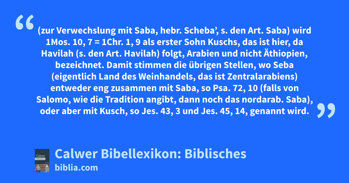 Damit stimmen die übrigen Stellen, wo Seba (eigentlich Land des Weinhandels, das ist Zentralarabiens) entweder eng zusammen mit Saba, so Psa. 72, 10 (falls von Salomo, wie die Tradition angibt, dann noch das nordarab. Saba), oder aber mit Kusch, so Jes. 43, 3 und Jes. 45, 14, genannt wird.