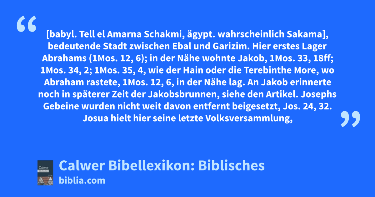Sichem [babyl. Tell el Amarna Schakmi, ägypt. wahrscheinlich Sakama], bedeutende Stadt zwischen Ebal und Garizim. Hier erstes Lager Abrahams (1Mos. 12, 6); in der Nähe wohnte Jakob, 1Mos. 33, 18ff; 1Mos. 34, 2; 1Mos. 35, 4, wie der Hain oder die Terebinthe More, wo Abraham rastete, 1Mos. 12, 6, in der Nähe lag. An Jakob erinnerte noch in späterer Zeit der Jakobsbrunnen, siehe den Artikel. Josephs Gebeine wurden nicht weit davon entfernt beigesetzt, Jos. 24, 32.