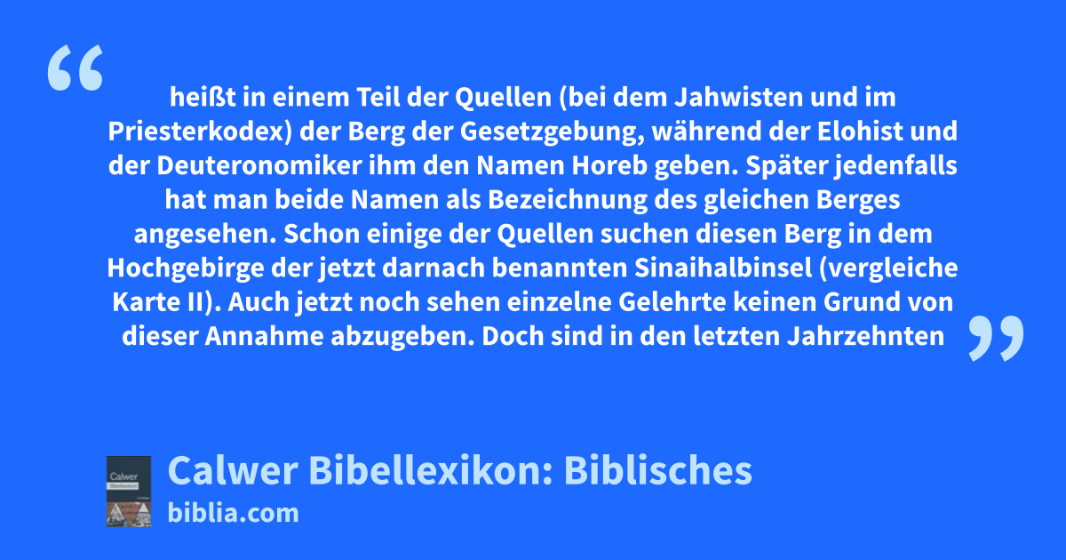 Sinai heißt in einem Teil der Quellen (bei dem Jahwisten und im Priesterkodex) der Berg der Gesetzgebung, während der Elohist und der Deuteronomiker ihm den Namen Horeb geben. Später jedenfalls hat man beide Namen als Bezeichnung des gleichen Berges angesehen. Schon einige der Quellen suchen diesen Berg in dem Hochgebirge der jetzt darnach benannten Sinaihalbinsel (vergleiche Karte II). Auch jetzt noch sehen einzelne Gelehrte keinen Grund von dieser Annahme abzugeben. Doch sind in den letzten Jahrzehnten viele Gelehrte zu anderer Ansicht gekommen