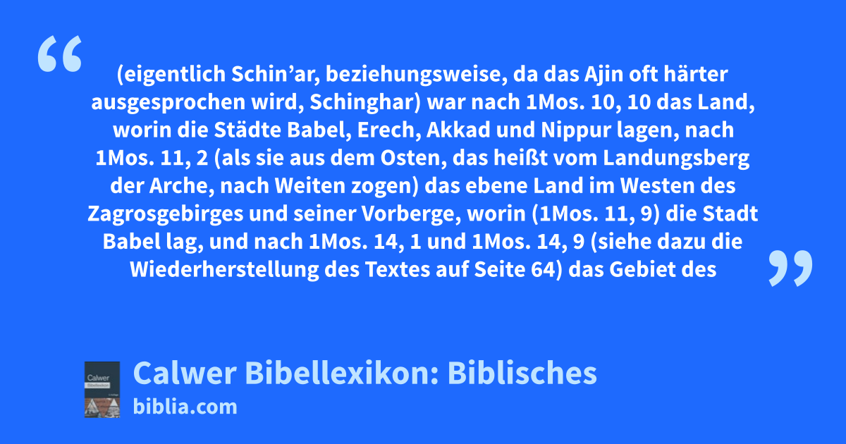 Sinear (eigentlich Schin’ar, beziehungsweise, da das Ajin oft härter ausgesprochen wird, Schinghar) war nach 1Mos. 10, 10 das Land, worin die Städte Babel, Erech, Akkad und Nippur lagen, nach 1Mos. 11, 2 (als sie aus dem Osten, das heißt vom Landungsberg der Arche, nach Weiten zogen) das ebene Land im Westen des Zagrosgebirges und seiner Vorberge, worin (1Mos. 11, 9) die Stadt Babel lag, und nach 1Mos. 14, 1 und 1Mos. 14, 9 (siehe dazu die Wiederherstellung des Textes auf Seite 64) das Gebiet des Königs Amraph (Hammurapi), über welches der König von Larsa die Oberhoheit ausübte, also wohl Nordbabylonien (hier vielleicht mit Ausschluss von Erech).