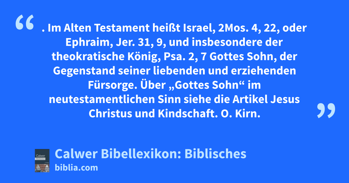 Sohn. Im Alten Testament heißt Israel, 2Mos. 4, 22, oder Ephraim, Jer. 31, 9, und insbesondere der theokratische König, Psa. 2, 7 Gottes Sohn, der Gegenstand seiner liebenden und erziehenden Fürsorge. Über „Gottes Sohn“ im neutestamentlichen Sinn siehe die Artikel Jesus Christus und Kindschaft.