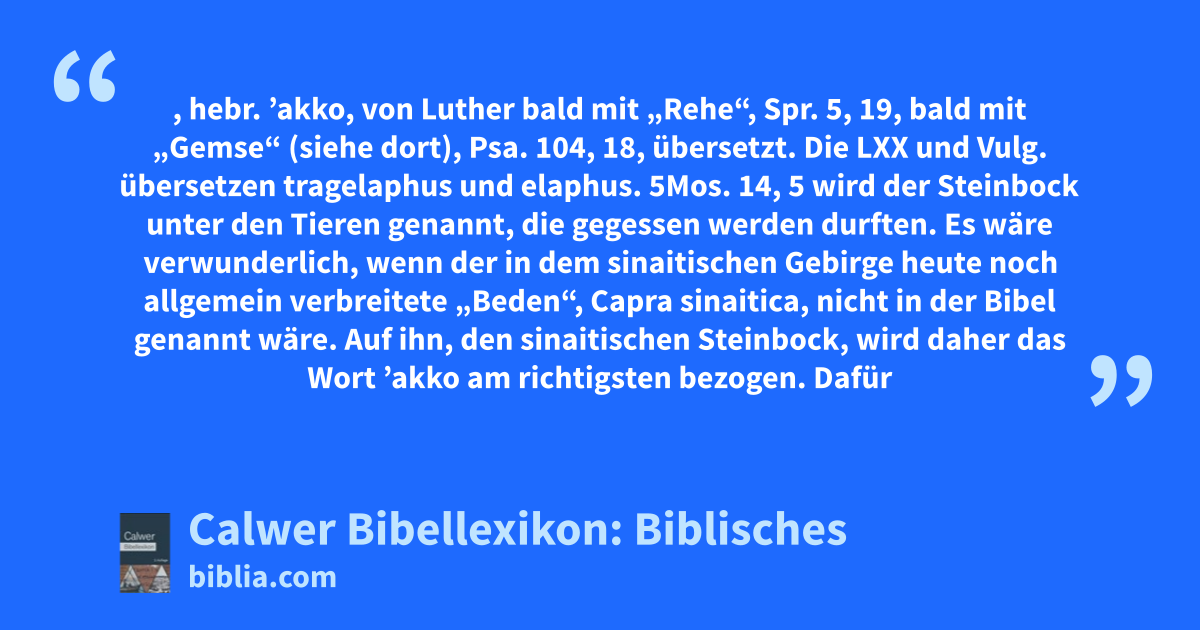 Steinbock, hebr. ’akko, von Luther bald mit „Rehe“, Spr. 5, 19, bald mit „Gemse“ (siehe dort), Psa. 104, 18, übersetzt. Die LXX und Vulg. übersetzen tragelaphus und elaphus. 5Mos. 14, 5 wird der Steinbock unter den Tieren genannt, die gegessen werden durften. Es wäre verwunderlich, wenn der in dem sinaitischen Gebirge heute noch allgemein verbreitete „Beden“, Capra sinaitica, nicht in der Bibel genannt wäre.