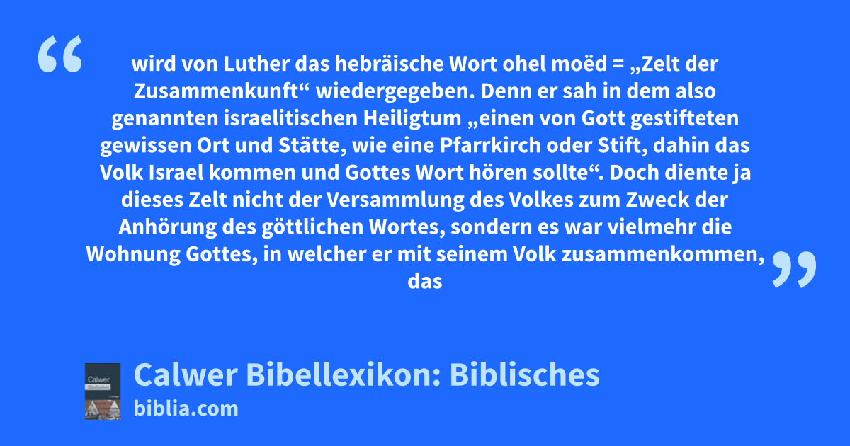 Stiftshütte wird von Luther das hebräische Wort ohel moëd = „Zelt der Zusammenkunft“ wiedergegeben. Denn er sah in dem also genannten israelitischen Heiligtum „einen von Gott gestifteten gewissen Ort und Stätte, wie eine Pfarrkirch oder Stift, dahin das Volk Israel kommen und Gottes Wort hören sollte“. Doch diente ja dieses Zelt nicht der Versammlung des Volkes zum Zweck der Anhörung des göttlichen Wortes, sondern es war vielmehr die Wohnung Gottes, in welcher er mit seinem Volk zusammenkommen, das heißt, sich ihm offenbaren und dessen Opfer und Gebete entgegennehmen wollte. Darauf weist auch der andere Name dieses Zeltes „Wohnung oder Hütte des Zeugnisses“ hin, 2Mos. 38, 21; 4Mos. 1, 50. 4Mos. 1, 53; 4Mos. 9, 15; 4Mos. 17, 7f., wodurch dieses Zelt als Stätte der göttlichen Offenbarung, der Bundeslade mit den Gesetzestafeln, bezeichnet wird. Am klarsten wird der Zweck und die Bedeutung desselben ausgesprochen, 2Mos. 25, 8: „sie sollen mir ein Heiligtum machen, dass ich unter ihnen wohnen.“ An dieses Heiligtum sollte sich das ganze gottesdienstliche Leben des israelitischen Volkes anschließen. Es wird darum auch sogleich nach dem feierlichen Bundesopfer 2Mos. 24 die Anweisung zur Errichtung desselben gegeben, 2Mos. 25–27 und 2Mos. 30. 2Mos. 31, und nachher fast ebenso eingehend über die Ausführung des Baues berichtet, Kap. 2Mos. 36–38.