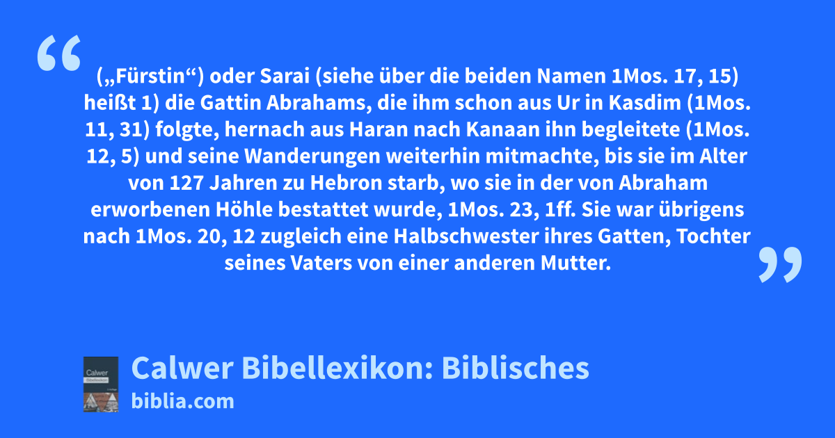1) die Gattin Abrahams, die ihm schon aus Ur in Kasdim (1Mos. 11, 31) folgte, hernach aus Haran nach Kanaan ihn begleitete (1Mos. 12, 5) und seine Wanderungen weiterhin mitmachte, bis sie im Alter von 127 Jahren zu Hebron starb, wo sie in der von Abraham erworbenen Höhle bestattet wurde, 1Mos. 23, 1ff.