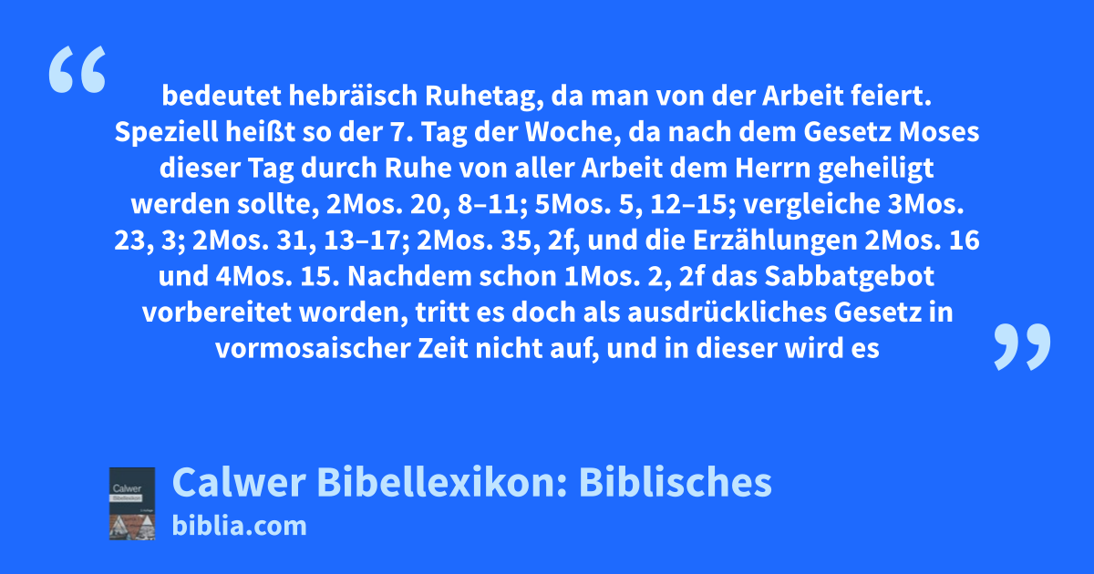 Sabbat, Sabbattag bedeutet hebräisch Ruhetag, da man von der Arbeit feiert. Speziell heißt so der 7. Tag der Woche, da nach dem Gesetz Moses dieser Tag durch Ruhe von aller Arbeit dem Herrn geheiligt werden sollte, 2Mos. 20, 8–11; 5Mos. 5, 12–15; vergleiche 3Mos. 23, 3; 2Mos. 31, 13–17; 2Mos. 35, 2f, und die Erzählungen 2Mos. 16 und 4Mos. 15.