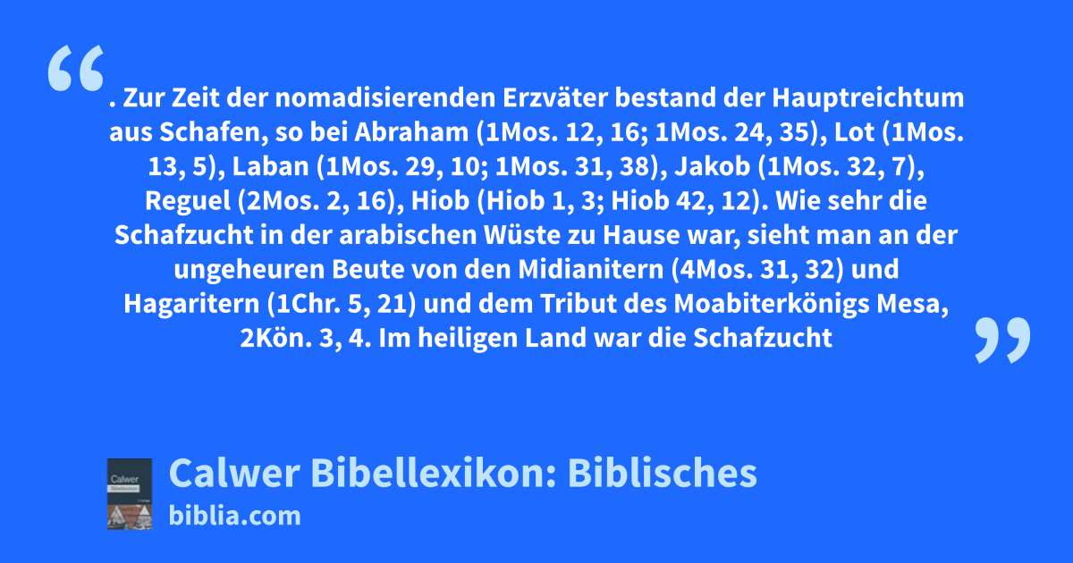 Schaf. Zur Zeit der nomadisierenden Erzväter bestand der Hauptreichtum aus Schafen, so bei Abraham (1Mos. 12, 16; 1Mos. 24, 35), Lot (1Mos. 13, 5), Laban (1Mos. 29, 10; 1Mos. 31, 38), Jakob (1Mos. 32, 7), Reguel (2Mos. 2, 16), Hiob (Hiob 1, 3; Hiob 42, 12). Wie sehr die Schafzucht in der arabischen Wüste zu Hause war, sieht man an der ungeheuren Beute von den Midianitern (4Mos. 31, 32) und Hagaritern (1Chr. 5, 21) und dem Tribut des Moabiterkönigs Mesa, 2Kön. 3, 4. Im heiligen Land war die Schafzucht besonders ergiebig in Gilead und Basan, Karmel und Saron, Micha 7, 14; Jes. 65, 10, und in der Wüste Judas, 1Sam. 25, 2; Jes. 7, 25. Dass Kanaan mit Schafen gesegnet war, zeigt 5Mos. 32, 14; Ps. 65, 14; Psa. 144, 13. Wir sehen namentlich die Könige, einen David, 1Chr. 27, 31, Salomo, Spr. 2, 7, Usia und Hiskia, 2Chr. 26, 10; 2Chr. 32, 28, als Schafzüchter.