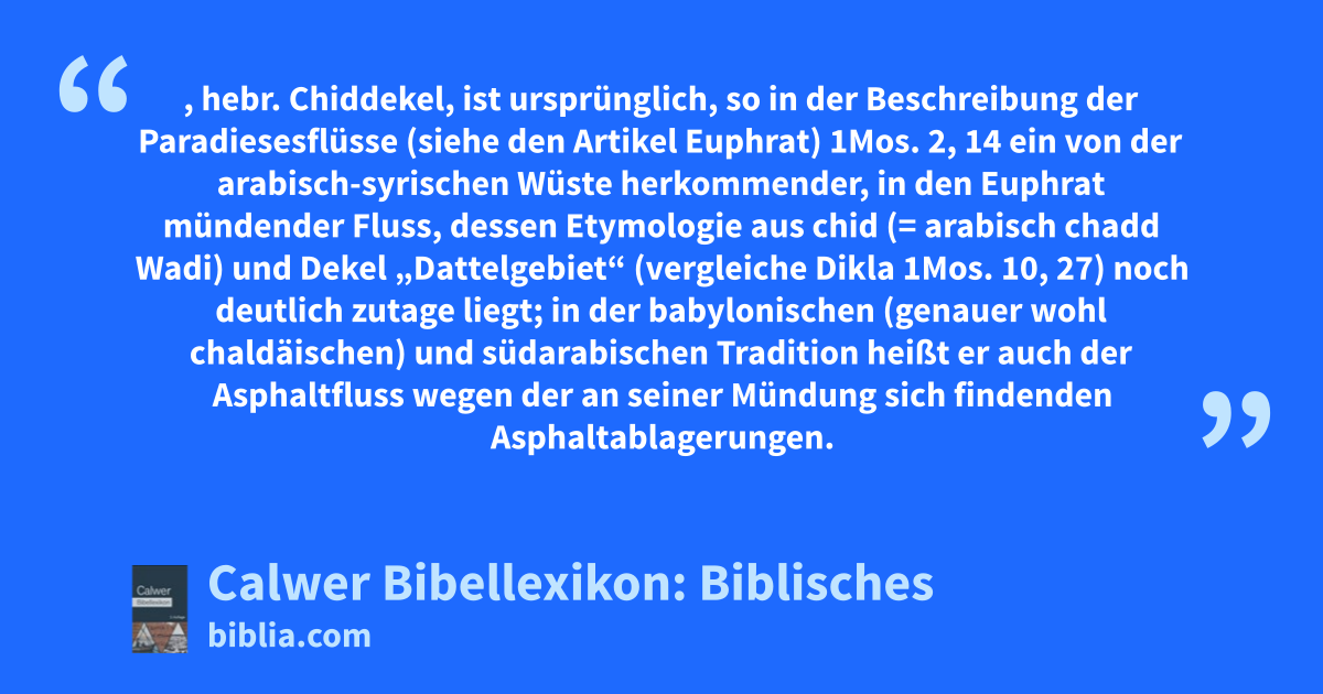 Tigris, hebr. Chiddekel, ist ursprünglich, so in der Beschreibung der Paradiesesflüsse (siehe den Artikel Euphrat) 1Mos. 2, 14 ein von der arabisch-syrischen Wüste herkommender, in den Euphrat mündender Fluss, dessen Etymologie aus chid (= arabisch chadd Wadi) und Dekel „Dattelgebiet“ (vergleiche Dikla 1Mos. 10, 27) noch deutlich zutage liegt; in der babylonischen (genauer wohl chaldäischen) und südarabischen Tradition heißt er auch der Asphaltfluss wegen der an seiner Mündung sich findenden Asphaltablagerungen.