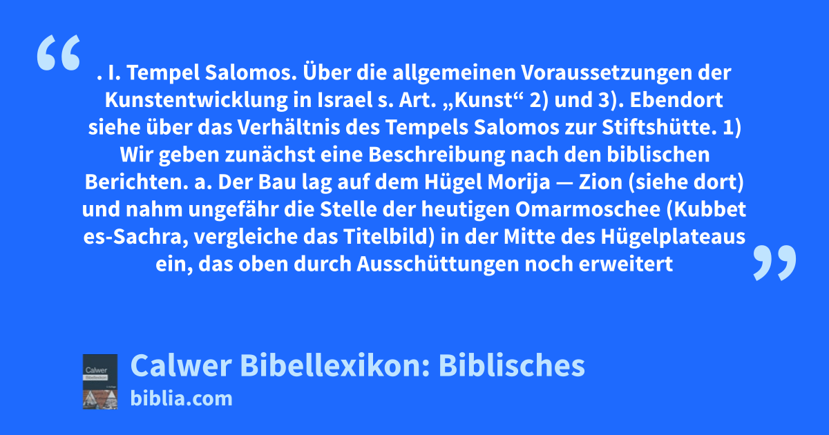 Die fabelhaft scheinenden großartigen Vorbereitungen zu dem Bau (circa 960 vor Christus), wie sie 1. Könige 5, 27 folgende schildert, erhalten ihre Bestätigung durch manche Reliefplatte aus Nimrud (Ninive), welche ähnliche Unternehmungen orientalischer Herrscher im Steinbild zeigt. Ohne Zweifel führte schon damals über die Schlucht auf der Westseite eine Brücke zur Morija-Plattform, die durch Herodes wieder erneuert wurde und deren Reste noch stehen. Bekannt sind die zwei Vorhöfe (des Volkes und der Priester), welche den Tempel umschlossen. Sie hatten mehrere Tore nach außen und innen.