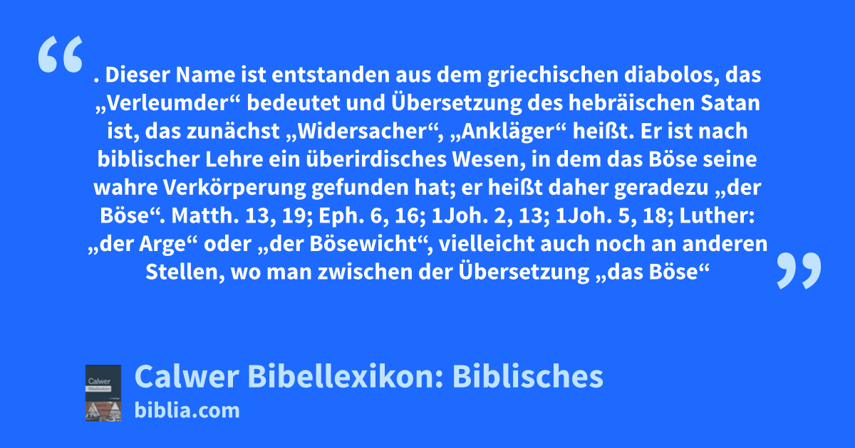 Teufel. Dieser Name ist entstanden aus dem griechischen diabolos, das „Verleumder“ bedeutet und Übersetzung des hebräischen Satan ist, das zunächst „Widersacher“, „Ankläger“ heißt. Er ist nach biblischer Lehre ein überirdisches Wesen, in dem das Böse seine wahre Verkörperung gefunden hat; er heißt daher geradezu „der Böse“. Matth. 13, 19; Eph. 6, 16; 1Joh. 2, 13; 1Joh. 5, 18; Luther: „der Arge“ oder „der Bösewicht“, vielleicht auch noch an anderen Stellen, wo man zwischen der Übersetzung „das Böse“ oder „der Böse“ die Wahl hat: Matth. 5, 37 (ist vom Bösen?); Matth. 6, 13 (erlöse uns von dem Bösen?); Matth. 13, 38 (das Unkraut sind die Kinder des Bösen?); Joh. 17, 15 (dass du sie bewahrest von dem Bösen?); 2Thes. 3, 3 (bewahren vor dem Bösen?); 1Joh. 3, 12 (Kain, der von dem Bösen war?); 1Joh. 5, 19 (die Welt liegt im Bösen?).