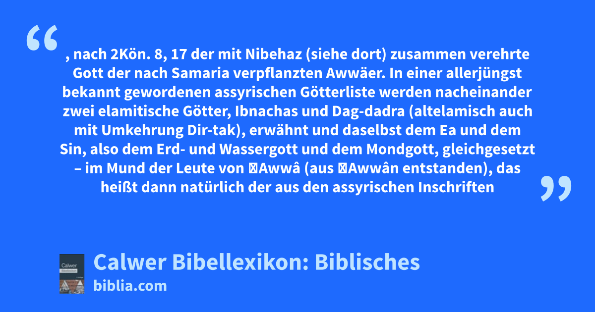 In einer allerjüngst bekannt gewordenen assyrischen Götterliste werden nacheinander zwei elamitische Götter, Ibnachas und Dag-dadra (altelamisch auch mit Umkehrung Dir-tak), erwähnt und daselbst dem Ea und dem Sin, also dem Erd- und Wassergott und dem Mondgott, gleichgesetzt – im Mund der Leute von ῾Awwâ (aus ῾Awwân entstanden), das heißt dann natürlich der aus den assyrischen Inschriften bekannten elamitischen (dem Gebiet Râs, hebräisch Ros, angehörenden) Stadt Chamânu (Chawânu), Nibhas und Tharthak genannt!