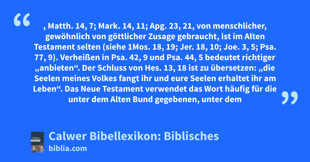 Verheißen, Verheißung, Matth. 14, 7; Mark. 14, 11; Apg. 23, 21, von menschlicher, gewöhnlich von göttlicher Zusage gebraucht, ist im Alten Testament selten (siehe 1Mos. 18, 19; Jer. 18, 10; Joe. 3, 5; Psa. 77, 9).
