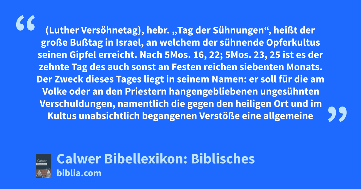 — Die Idee der Sühnung, welche das ganze Opferwesen des Alten Bundes durchzieht, tritt uns in der Feier dieses Tages am klarsten und in vollendeter Größe entgegen. Da wird durch ein Gesamtopfer für alle Verschuldungen des Volkes (natürlich soweit diese durch die Gnadenmittel des Alten Bundes sühnbar waren) Sühne gewirkt und für alle Befleckungen des Heiligtums eine Reinigung beschafft. Der Hohepriester, dem der Heiligkeitscharakter in höchstem Grade eigen ist, tritt dabei in den allerheiligsten Raum. Bildete so dieser Tag den Höhepunkt des Opferkultus, so ist auffällig, dass er im Alten Testament abgesehen von 3Mos. 16 nirgends deutlich erwähnt wird. Dass er eine erst nachexilische Schöpfung war, lässt sich freilich daraus nicht folgern. Hingegen scheint er in vorexilischer Zeit mehr ein Fest der Priesterschaft gewesen zu sein. In besonderem Maße ist dieser Ritus des Versöhnungstages für das neutestamentliche Versöhnungswerk vorbildlich. Der Verfasser des Hebräerbriefes hat bei seiner Vergleichung zwischen Jesus Christus und dem Hohepriester Aaron namentlich den Versöhnungstag vor Augen und weist darauf hin, wie Christi Werk mit dieser wichtigen hohepriesterlichen Verrichtung Ähnlichkeit habe, sie aber weit übertreffe, Hebr. 9, 7ff. Hebr. 9, 12ff. Hebr. 9, 24ff. Auch Apg. 27, 9 ist mit dem Fasttage des Versöhnungstages gemeint.
