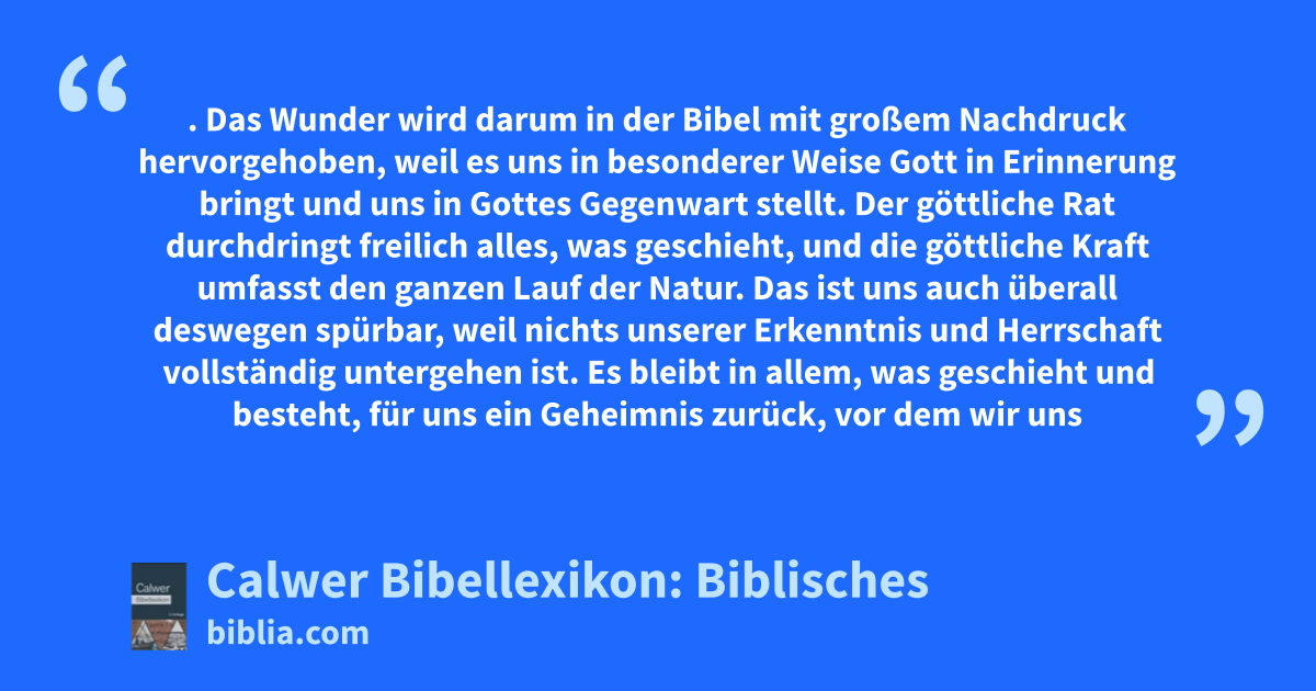 Wunder. Das Wunder wird darum in der Bibel mit großem Nachdruck hervorgehoben, weil es uns in besonderer Weise Gott in Erinnerung bringt und uns in Gottes Gegenwart stellt.