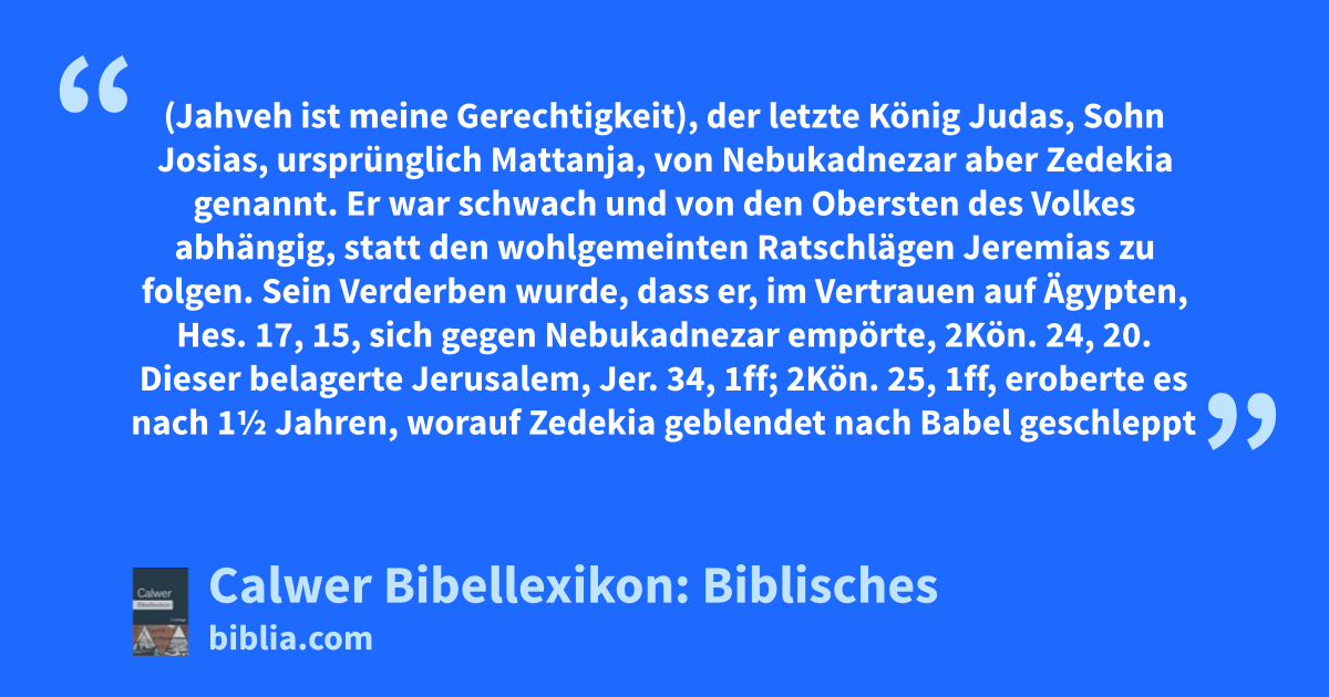 Er war schwach und von den Obersten des Volkes abhängig, statt den wohlgemeinten Ratschlägen Jeremias zu folgen. Sein Verderben wurde, dass er, im Vertrauen auf Ägypten, Hes. 17, 15, sich gegen Nebukadnezar empörte, 2Kön. 24, 20. Dieser belagerte Jerusalem, Jer. 34, 1ff; 2Kön. 25, 1ff, eroberte es nach 1½ Jahren, worauf Zedekia geblendet nach Babel geschleppt wurde, wo er bis zum Tod im Gefängnis blieb, Jer. 39, 5ff; Jer. 52, 10ff.