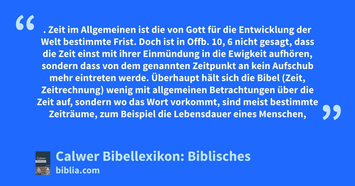 Zeit, Zeitrechnung. Zeit im Allgemeinen ist die von Gott für die Entwicklung der Welt bestimmte Frist. Doch ist in Offb. 10, 6 nicht gesagt, dass die Zeit einst mit ihrer Einmündung in die Ewigkeit aufhören, sondern dass von dem genannten Zeitpunkt an kein Aufschub mehr eintreten werde. Überhaupt hält sich die Bibel (Zeit, Zeitrechnung) wenig mit allgemeinen Betrachtungen über die Zeit auf, sondern wo das Wort vorkommt, sind meist bestimmte Zeiträume, zum Beispiel die Lebensdauer eines Menschen, 2Sam. 7, 12; Hiob 14, 5, oder Zeitpunkte, Apg. 1, 7, gemeint.
