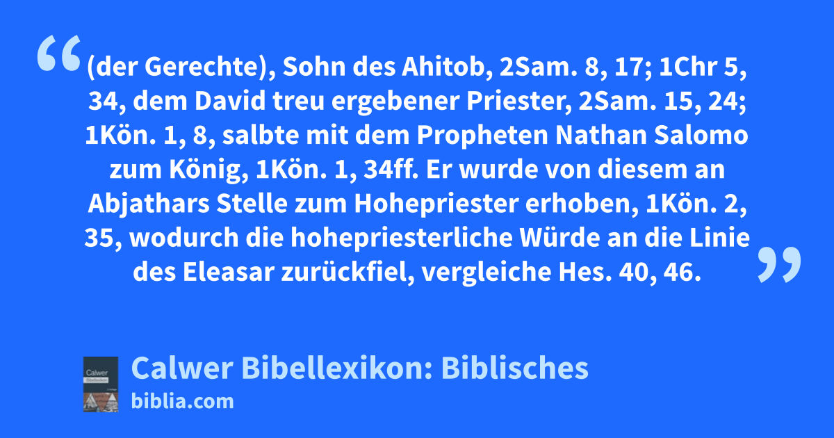 Er wurde von diesem an Abjathars Stelle zum Hohepriester erhoben, 1Kön. 2, 35, wodurch die hohepriesterliche Würde an die Linie des Eleasar zurückfiel, vergleiche Hes. 40, 46.