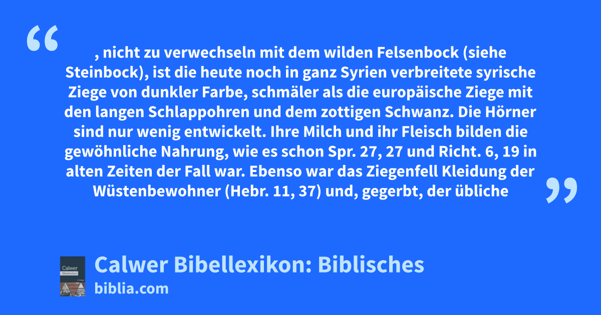 Ihre Milch und ihr Fleisch bilden die gewöhnliche Nahrung, wie es schon Spr. 27, 27 und Richt. 6, 19 in alten Zeiten der Fall war. Ebenso war das Ziegenfell Kleidung der Wüstenbewohner (Hebr. 11, 37) und, gegerbt, der übliche Schlauch zur Aufbewahrung und Transportierung von Getränken.